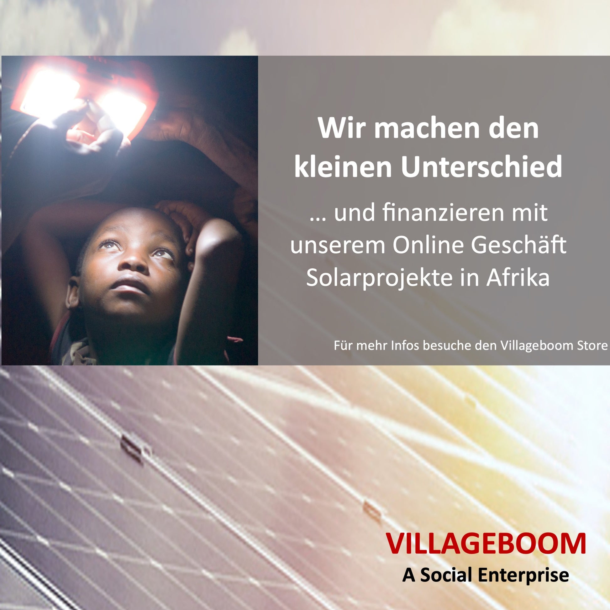 - Mit deinem Kauf Gutes tun – Unterstützung für Solarprojekte in Afrika Villageboom ist ein deutsches Unternehmen aus Münster, das sich seit 2008 für nachhaltige Entwicklung in Afrika einsetzt. Mit deinem Kauf unterstützt du unsere Solarlichtprojekte, die bereits über eine halbe Million Menschen in entlegenen Dörfern mit hellem, umweltfreundlichem Licht versorgt haben. So trägst du dazu bei, die Lebensqualität vor Ort zu verbessern und die Welt gerechter zu machen.